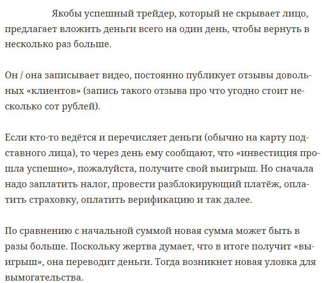 Суть развода состоит в том, что перед получением якобы заработанной «прибыли» инвестор должен был оплатить «комиссии» и «налоги». Мошенница требовала передавать деньги ей до тех пор, пока человек не понимал, что его обманули.