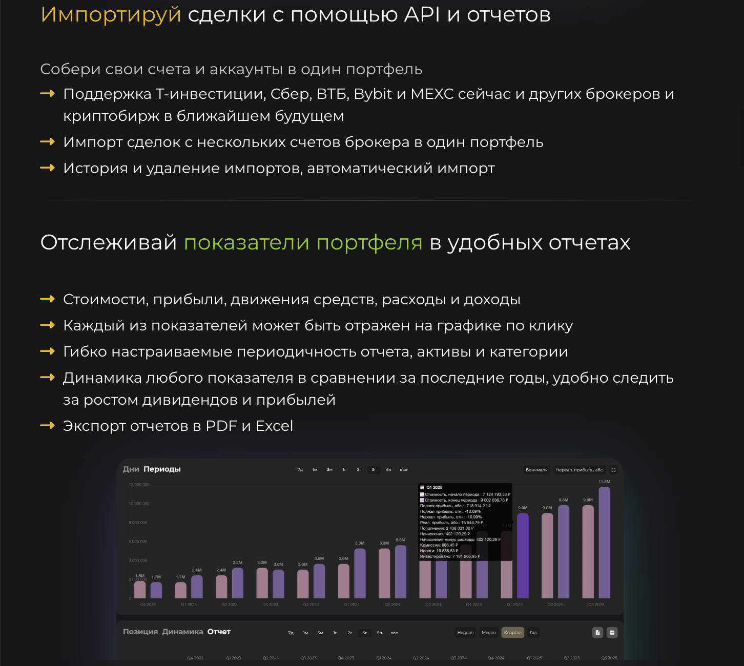 В публичной части приложение продает кейс учета портфеля и работу с множеством классов активов: акции, облигации, крипта, фьючерсы. В демо отчетах и публичных портфелях видно набор стандартных метрик: общее изменение, годовая доходность, распределение по секторам, метрики волатильности и графики временной доходности. Также можно применить импорт через биржевые API.Маркетинг довольно лаконичный, без обещаний гарантированной прибыли. Однако отсутствие подробной документации по безопасности API и хранению приватных ключей вызывает вопросы у тех, кто в теме и понимает, как легко скомпрометировать учетные записи при плохой реализации.