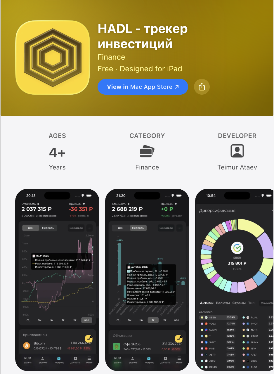 В App Store, приложение можно найти по ключевому слову Hadlapp. Оно классифицируется как трекер инвестиций, разработанный Тимуром Атаевым. Наличие официального приложения в апп сторе добавляет кредит доверия, но не гарантирует стопроцентной безопасности.