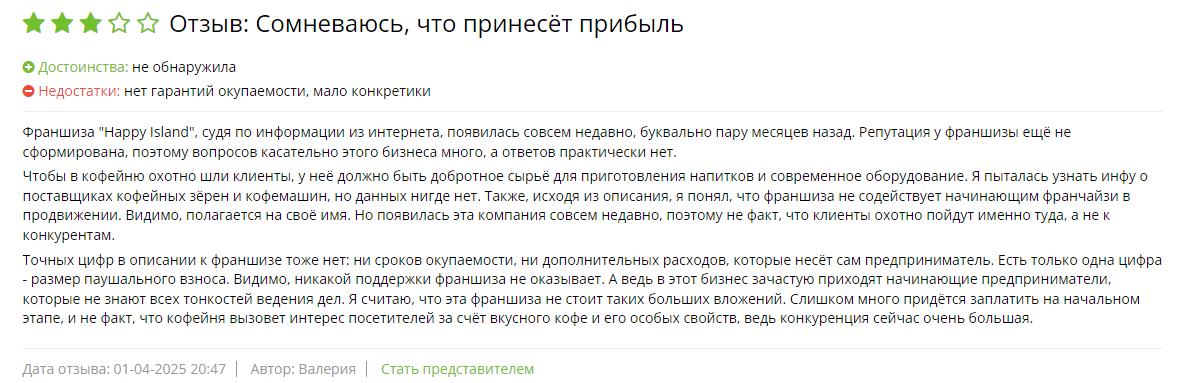 Мы проверили особенности запуска франшизы «Хэппи Исланд» и работу основателей платформы, и пришли к выводу, что инвестировать именно в этот кофейный бизнес точно не стоит. Мы не можем рекомендовать пользователям финансово вкладываться в запуск кофейни «ХэппиАйленд» и взаимодействовать с ее разработчиками.