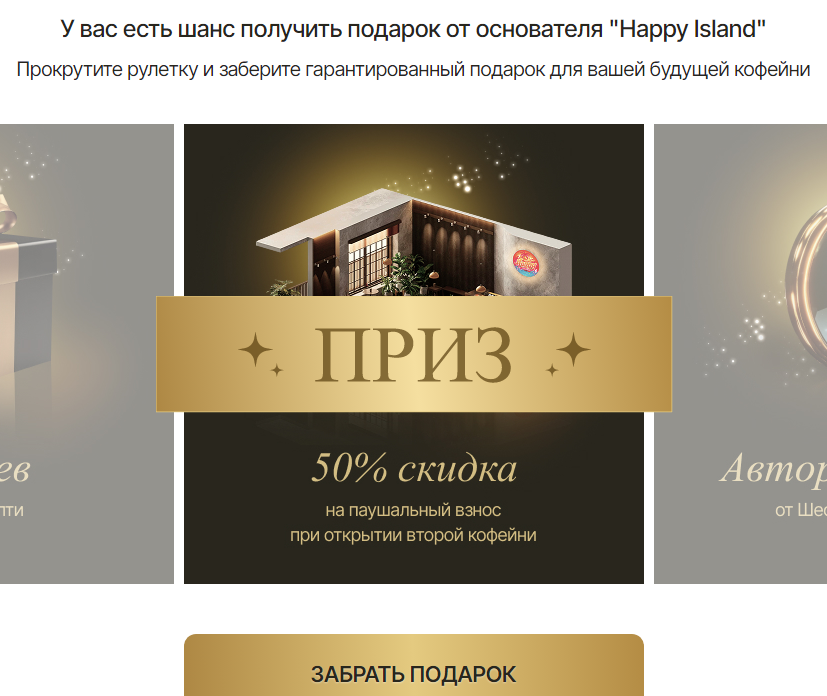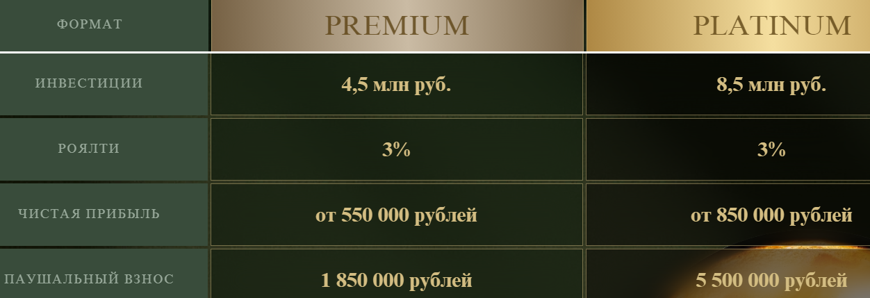 На площадке есть возможность выбора стратегии «Премиум» или «Платинум». Инвестировать в кофейный бизнес предприниматели могут 4 500 000 либо 8 500 000 рублей. При этом прибыль владельцы проекта обещают на сумму от 550 000 рублей при бюджетной стратегии и от 850 000 рублей при выборе тарифа «Платинум». Юзерам, решившим вложиться во франшизу «Хэппи Айленд», основатель кофейной сети обещает сделать подарок в виде 50% скидки на паушальный взнос при запуске очередной, второй кофейни предоставления услуг авторского надзора и других призов.