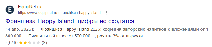 Организаторы франшизы «Хэппи Исланд» утверждают, что платформа обладает положительной репутацией. Владельцы инвестсервиса обещают, что граждане смогут запустить кофейню за 3 месяца благодаря предоставлению помощи профильными экспертами компании. Разработчики бизнес-идеи заявляют, что 90% работы уже сделано, потенциальным инвесторам нужно только решиться на совершение вложения средств в прибыльное дело.