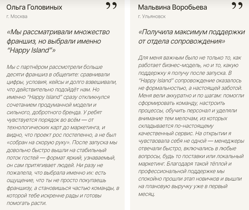 На сайте HappyIsland размещены позитивные комментарии от франчайзи и партнеров.