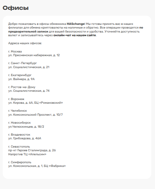 Филиалы HasChange для обмена криптовалюты на наличные и обратно есть в Екатеринбурге, Москве, Санкт-Петербурге и ещё нескольких крупных городах России. Проверка показала, что информация фейковая, офисы компании на самом деле не зарегистрированы. На сайте указано, что все операции в филиалах проводятся по предварительной записи для безопасности и удобства клиентов. Уточнить доступность валют и записаться можно через онлайн-чат прямо на сайте.