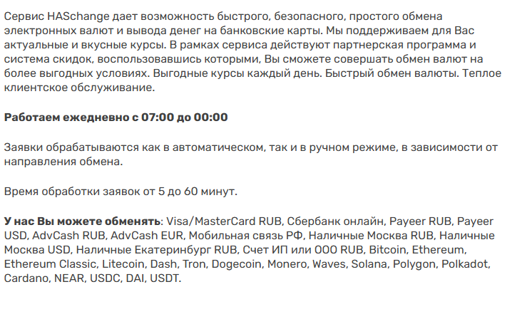 Заявки на сайте «Хас Чендж» обрабатываются и вручную, и автоматически – зависит от направления перевода. Среднее время варьируется от 5 минут до часа. Для обмена принимаются банковские карты Visa и MasterCard, электронные кошельки Payeer, AdvCash, мобильная связь РФ, счет ИП или ООО и разные виды крипты.
