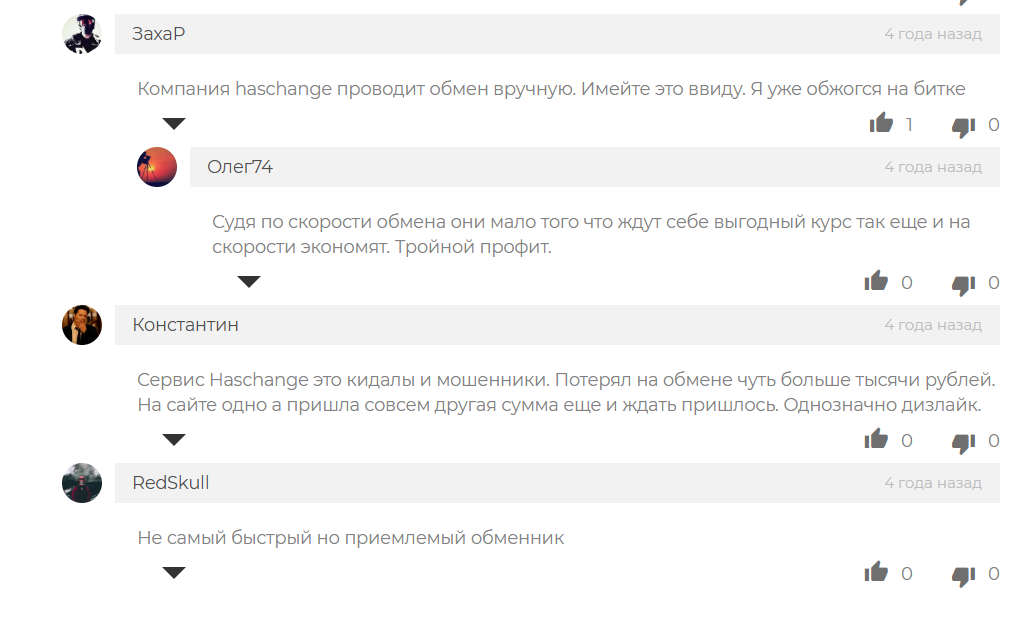 В открытых источниках также опубликованы как положительные, так и нейтральные отзывы о HasChange com, но встречаются и негативные комментарии. Один из пользователей жалуется, что вводил одну сумму, а обмен был произведён по другим данным. Кроме того, деньги пришлось долго ждать.