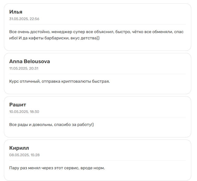 Сервис демонстрирует свой успех и популярность, публикуя прямо на сайте HasChange com отзывы довольных клиентов. Самый первый оставлен в 2017 году, последний добавлен 31 мая 2025 года – день написания обзора 13.06.2025. Клиенты благодарят за работу саппорта, скорость и простоту обмена. Ниже находится форма для заполнения и отправки своего отзыва, но все они наверняка проходят модерацию. Кроме того, авторы отзывов не идентифицированы, а значит, отзывы могут оказаться подделкой.