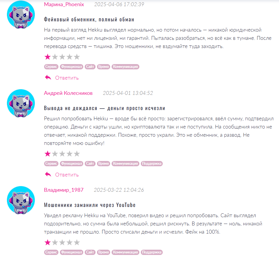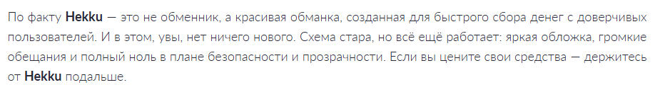 - негативные отзывы о Hekku com свидетельствуют о фактах присвоения средств обмена, повышается вероятность скама и развода на деньги;