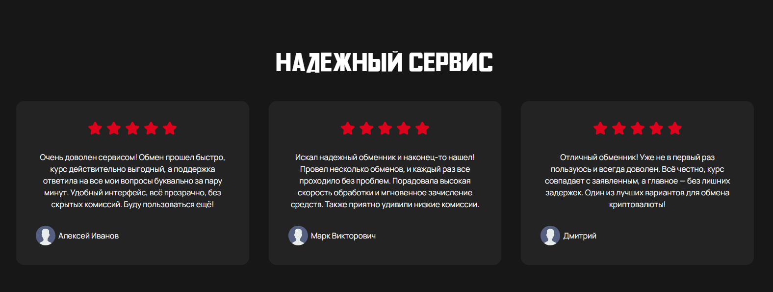 Положительные отзывы представлены только на собственном сайте криптообменника, в них клиенты благодарят организацию за высокое качество и надежность транзакций сервиса.