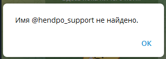 Связаться с техподдержкой можно через Telegram-канала @hendpo_support. При попытке найти это имя пользователя Телеграм выдает сообщение, что ничего не найдено.