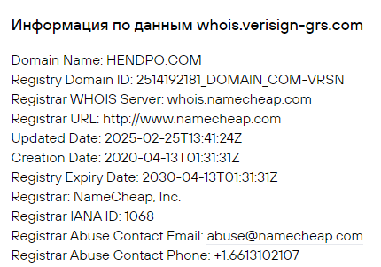 На официальном сайте hendpo com нет никакой информации о владельцах ресурса и выданных ему лицензиях. По данным WHOIS, домен был зарегистрирован в 2020 году. Столь долгий срок работы может говорить о надежности конторы или о том, что мошенники все это время искуссно маскировались под надежный проект.