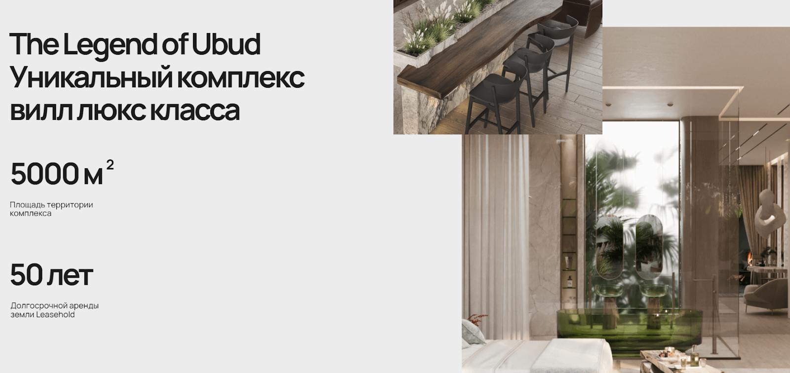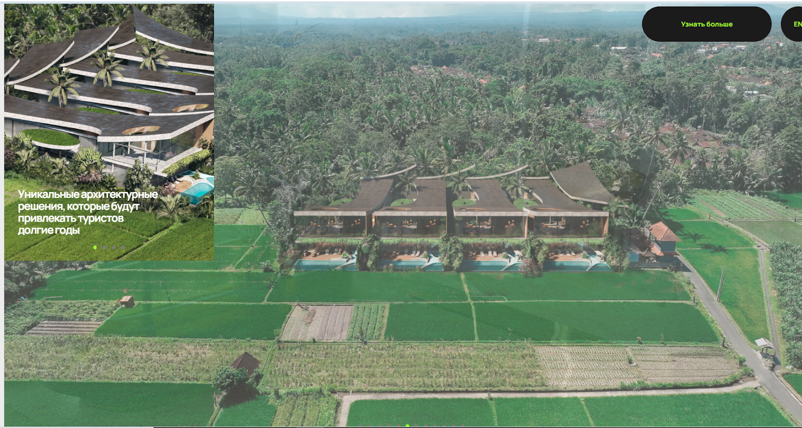 На официальном сайте компании Hit Dev сказано, что один из проектов называется The Legend of Ubud — комплекс вилл площадью около 5 000 м², с долгосрочной арендой земли на 50 лет, журнальными фразами об управлении без комиссии, без наценки за кв.м, доходностью от ежедневной аренды от 23% и доходом при перепродаже от 41%.