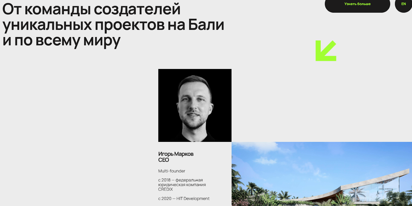 Также на сайте указано, что у компании есть команда: CEO Игорь Марков (с 2020 г. HIT Development), директор по развитию Роман Решетов и Геде Кетут Рудианта возглавляет строительный департамент в Индонезии.