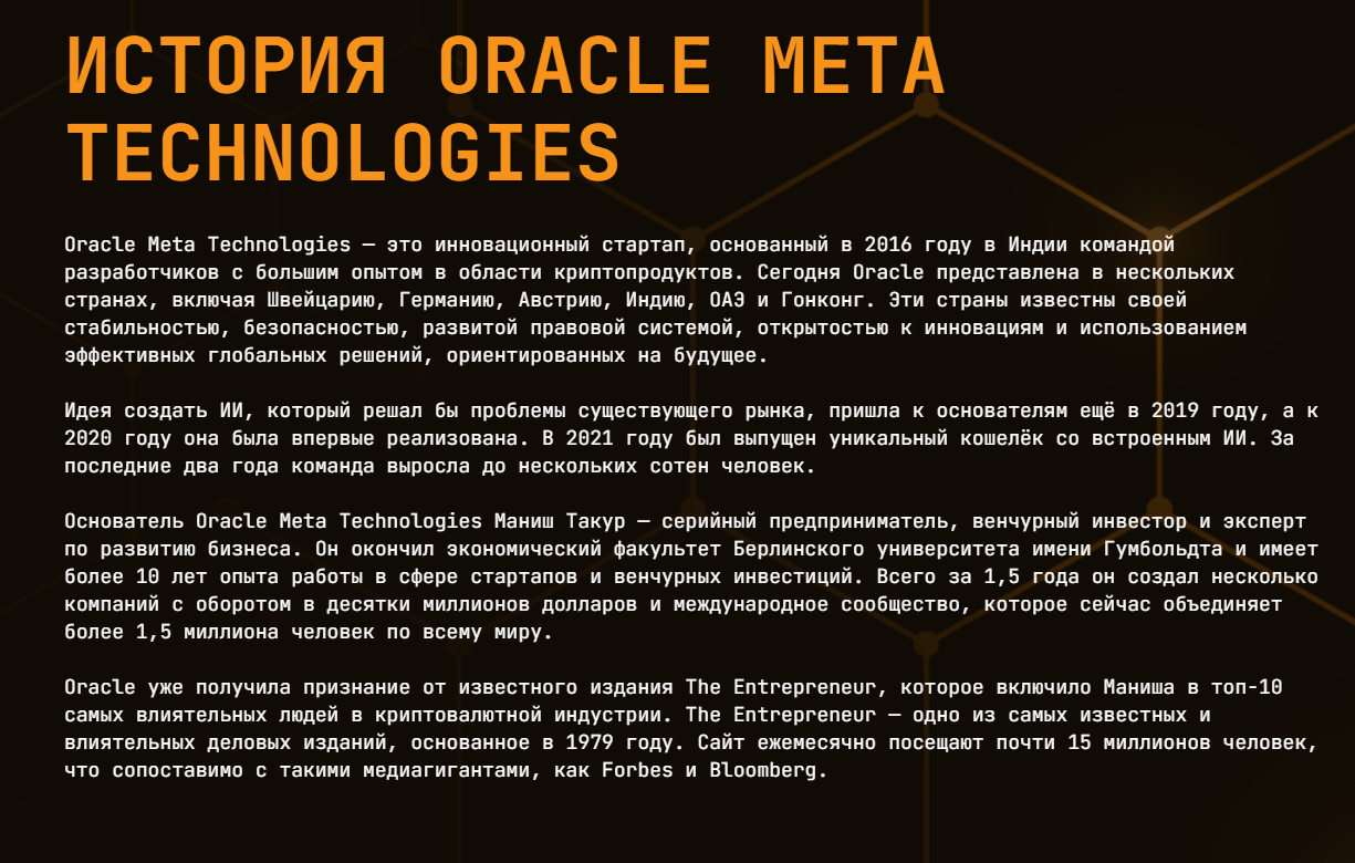 В самом начале мы уже обозначили, как сама компания себя позиционирует. Сам проект является продуктом компании Oracle Meta Technologies, которая является стартапом из Индии, основанным в 2016 году. Сегодня компания заявляет о представительстве в таких странах как: Германия, Австрия, ОАЭ и Гонконг. Основателем Oracle Meta Technologies числится Маниш Такур, упоминания которого в сфере криптовалют проскакивают довольно часто.