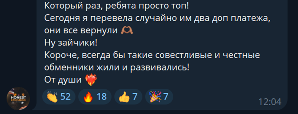 В сети редко встречаются отзывы о Honestcurrency, но можно найти достаточно материала, чтобы сформировать собственное мнение. В частности, есть официальная группа Honestexc otzivi. Там публикуются отзывы о Honest currency от «реальных пользователей». Проблема состоит в том, что несмотря на начало работы в 2021 году, после пары постов появляются сообщения только за конец 2024 года и более поздние. Все они сделаны в исключительно положительном ключе, в них часто упоминается двойной платеж, будто у менеджеров хроническая ошибка в этом месте. Но все довольны таким исходом событий. Верить в такие отзывы обмена Honest Currency не стоит.