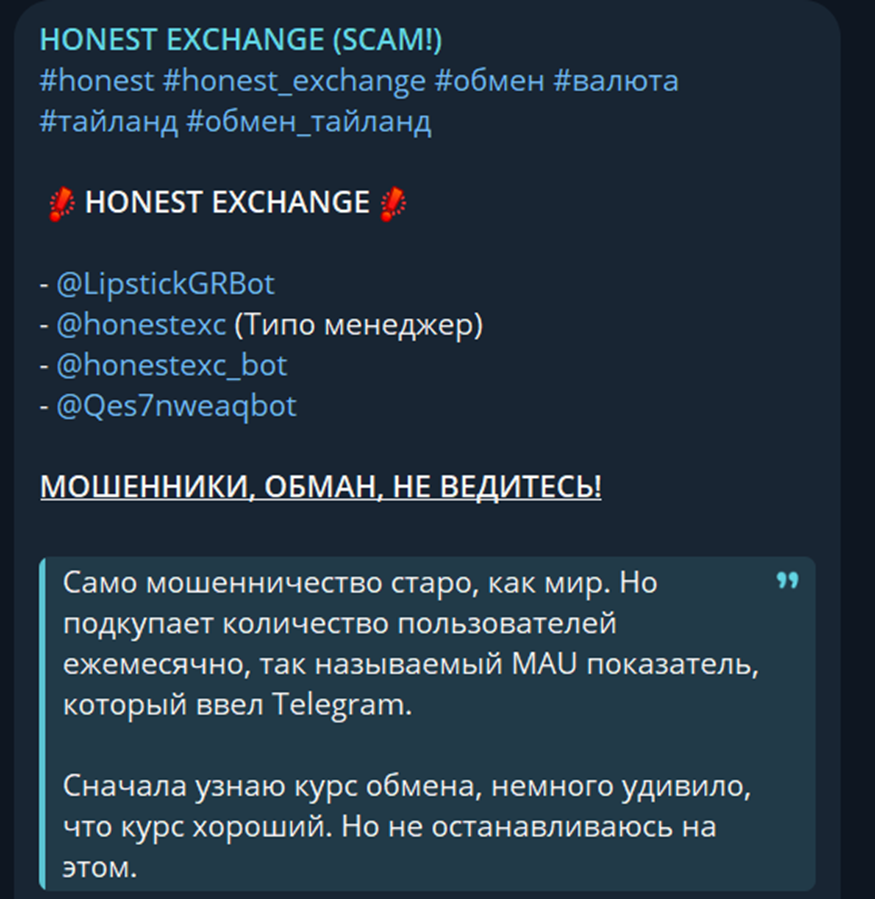Также есть отдельная группа Honest exchange scam, где собираются мошеннические площадки, чтобы пользователи заранее знали о скаме. Практически все боты данного проекта там есть.