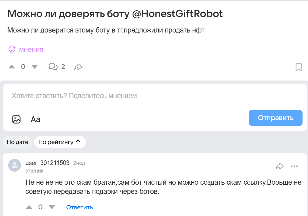На вопрос пользователя можно ли доверять данному боту, другой участник отвечает, что через данный сервис создаются скам операции для обмана клиентов. Другие отзывы о Honest gift robot отсутствуют.