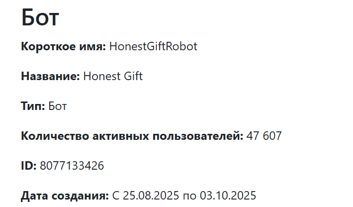 Количество активных пользователей TG проекта Honest gift составляло свыше 47 тыс. участников. При этом доказательств того, что публика была реальной, а цифры не являлись результатом накрутки, нет. Бот не просуществовал и двух месяцев. Он был запущен 25 августа и прекратил свою работу 3 октября 2025 года. Очевидно, такой короткий срок проекту дали его авторы, чтобы обогатиться за счет наивных пользователей и скрыться уже под другой маскировкой.
