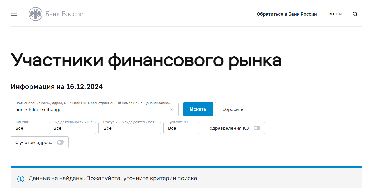 Других контактов не указано. Также как нет сведений об авторе проекта и его команде. Ничего не сказано и о наличии лицензии и регистрации. Впрочем, по информации Центробанка РФ известно, что Honestside Exchange лицензия не выдавалась.