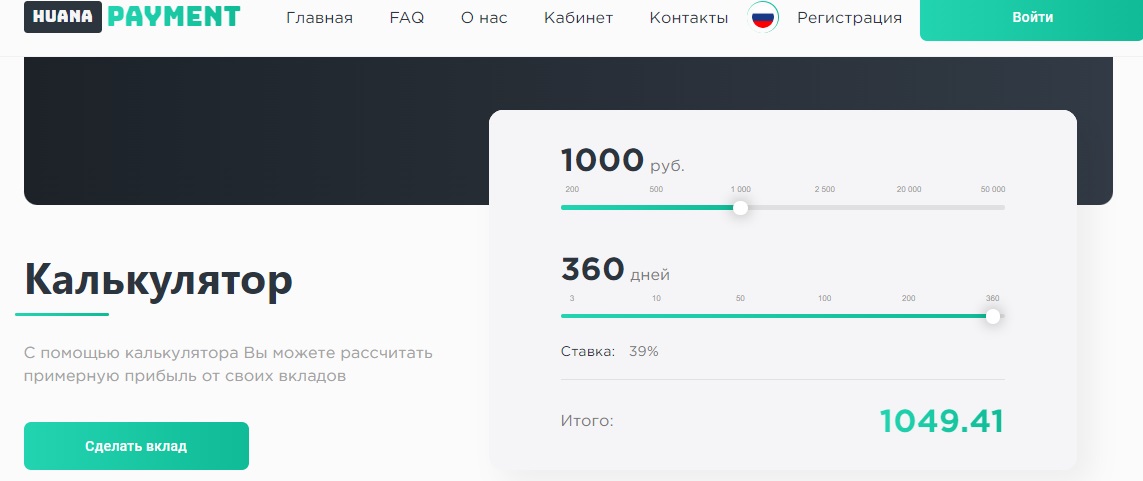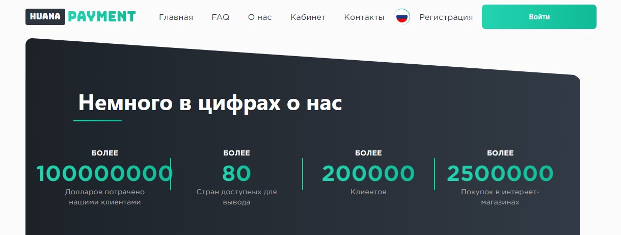 Все сделки осуществляются на сайте платформы huana pay cc. Чтобы продемонстрировать активную деятельность и востребованность, владельцы на главной странице разместили блок со статистикой, где указали, что услугами сервиса пользуются клиенты из 80 стран и они уже заключили сделок на сумму 100 триллионов долларов.