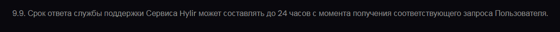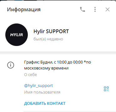 На сайте техподдержка доступна только в Telegram, она называется Hylir support и работает с 10 часов утра до полуночи.