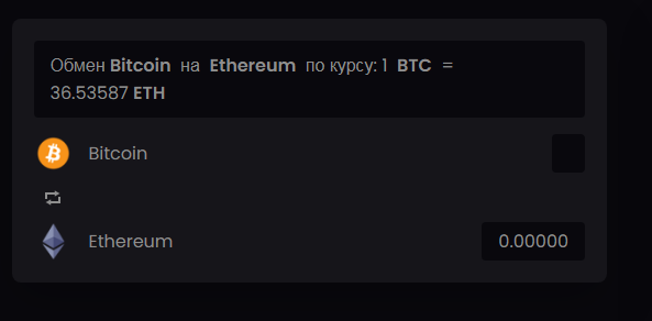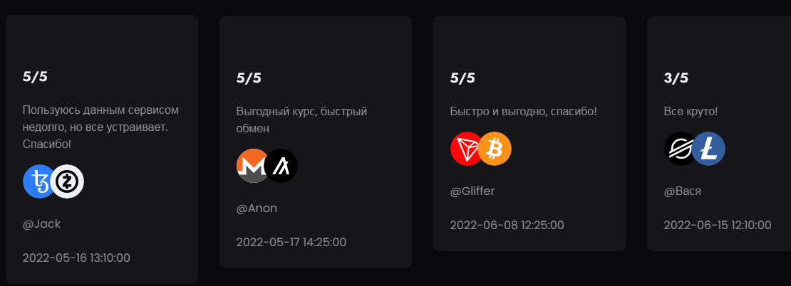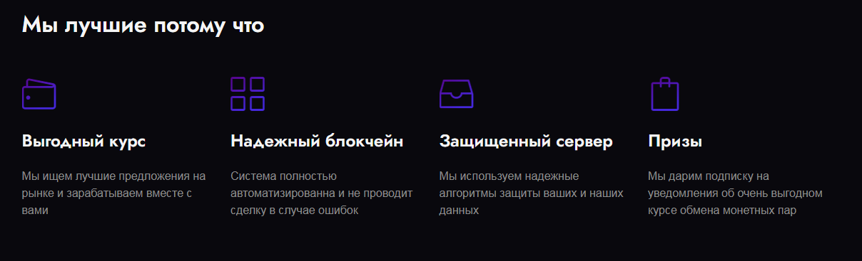 Владельцы предлагают клиентам быстрый способ торговли криптовалютой, о чем и говорится на главной странице ресурса. Интерфейс обменника поддерживает русский язык.