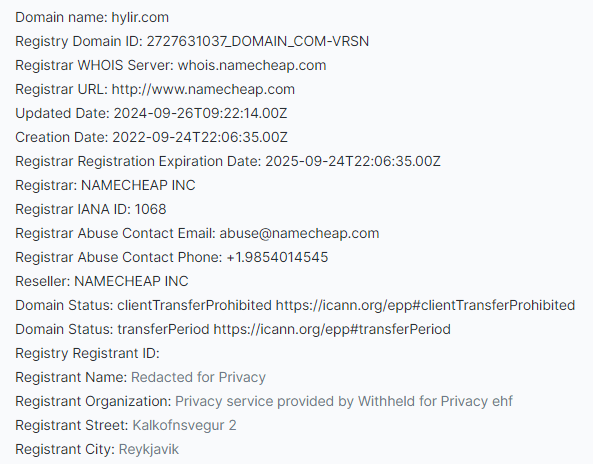 Сайт Hylir позиционирует себя как обменник криптовалют. На его страницах отсутствует информация о владельцах, юридическом адресе и лицензии, однако указано, что ресурс создан в 2022 году. Проверка домена показала, что он действительно был зарегистрирован в указанное время, регистратор находится в Рейкьявике.