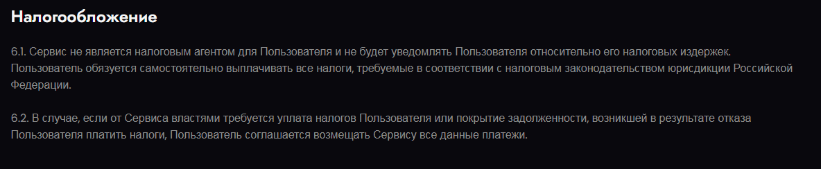 В пункте 6.2 правил говорится, что администрация имеет право взыскать с клиента средства в виде компенсации за уплату налогов. Это необходимо учитывать перед подачей заявки, чтобы внезапно не лишиться части своих средств.