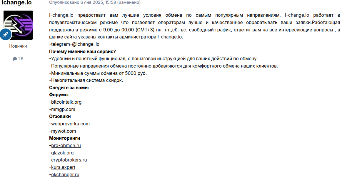 На одном из популярных форумов Bits Media финансовая платформа размещена 6 января 2025 года. Помимо маркетинговых упоминаний насчет лучших условий и популярных направлений есть еще список с преимуществами. Какие плюсы команда считает конкурентными:- Удобный и понятный функционал. Для подобных проектов это не редкость, так как инструментарий у обменников, включая I change io, ограничен лишь конвертацией активов.