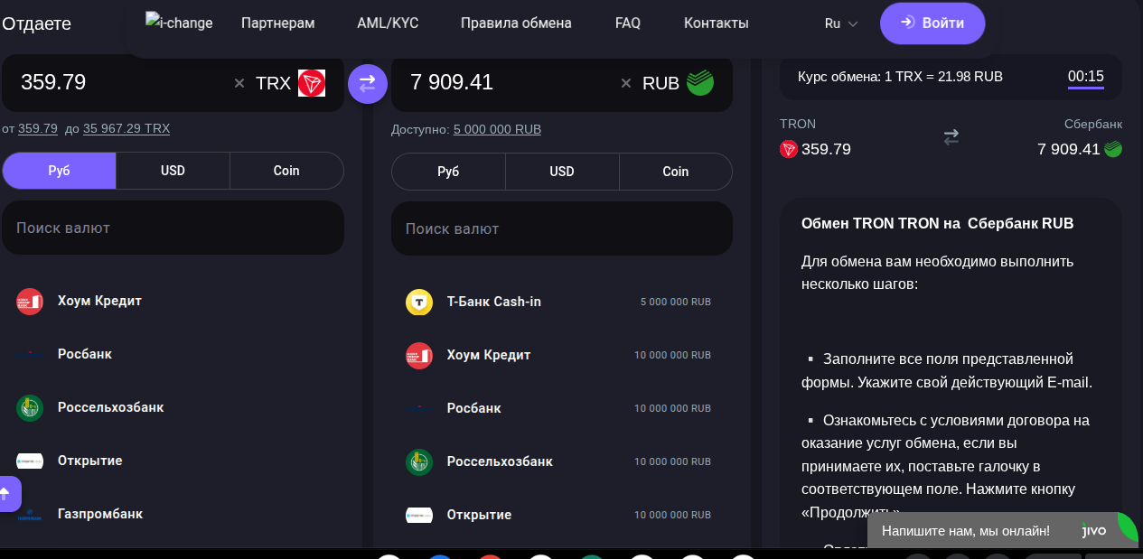- Минимальная сделка через инфраструктуру Ichange — 5000 рублей.