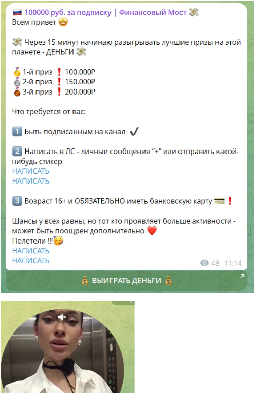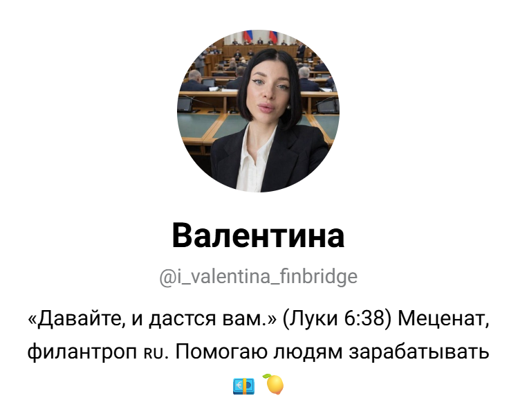 Администратор I Valentina Finbridge позиционирует себя как участника благотворительной деятельности. Для предоставления услуг девушка создала отдельный Телеграм-канал и предлагала участие в розыгрышах. До недавнего времени он был доступен по ссылке financy_bridge, но на апрель 2026-го уже не работает. Не исключено, что героиня обзора попросту поменяла название.