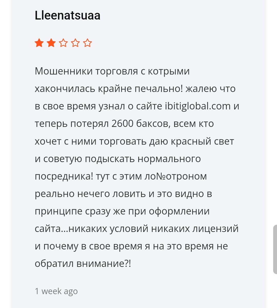 Особенно тревожно читать истории о внезапных блокировках счетов . Чаще всего это происходит сразу после пополнения баланса крупной суммой. После блокировки вернуть деньги становится практически нереально. Даже если человек готов предоставить Ibitiglobal com любые документы, которые от него требуют. Пользователи также массово жалуются на скрытые комиссии. Многие рассказывают, как реальные сборы оказывались в несколько раз выше заявленных.