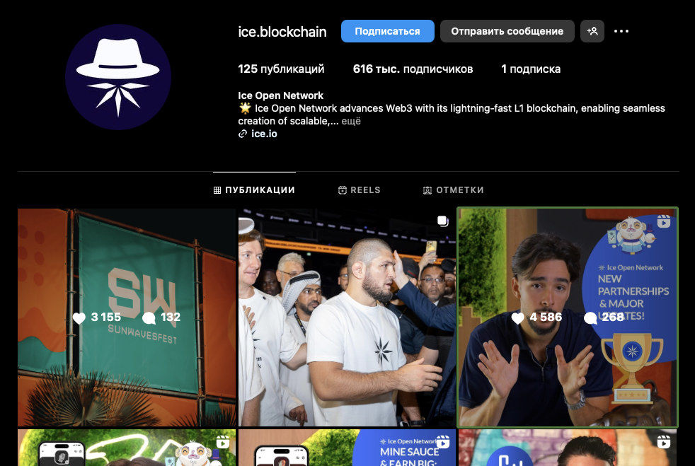 На страницу Ice Blockchain в Instagram подписано 616 тысяч пользователей. Посты собирают в среднем 2-5 тысяч лайков и несколько сотен комментариев.
