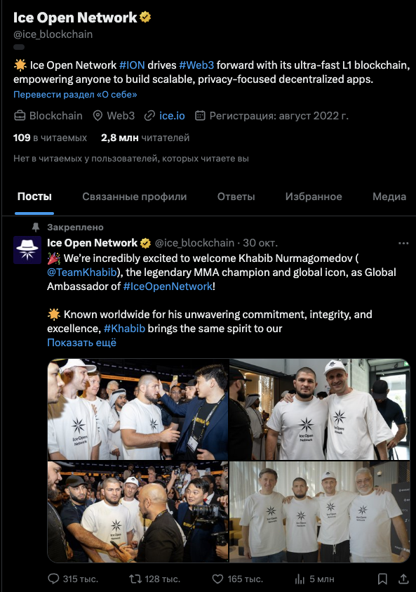 На страницу ice blockchain в Twitter подписано около 2,8 миллионов читателей. Выложенный 30 октября 2024-го года и закрепленный пост был показан около 5 миллионов раз.
