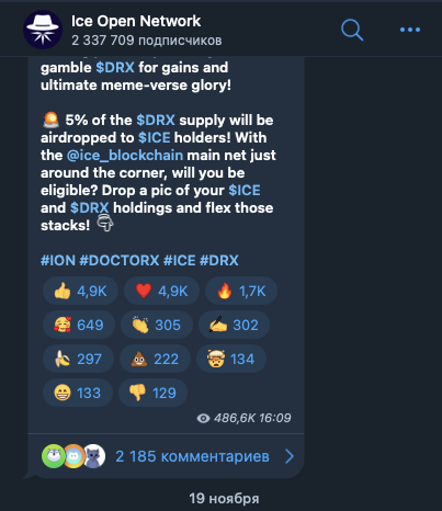 На телеграмм-канал Ice Open Network, iceblockchain, на 9 декабря 2024-го года, подписано около 2,34 миллионов пользователей. Публикации просматривают в среднем 400-500 тысяч раз.