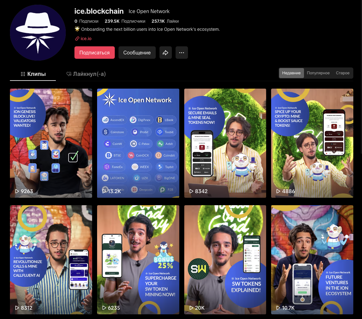 На аккаунт ice open network в TikTok подписано около 240 тысяч юзеров. В «ТикТок» контент дублирует тот, который опубликован на YouTube-канале.