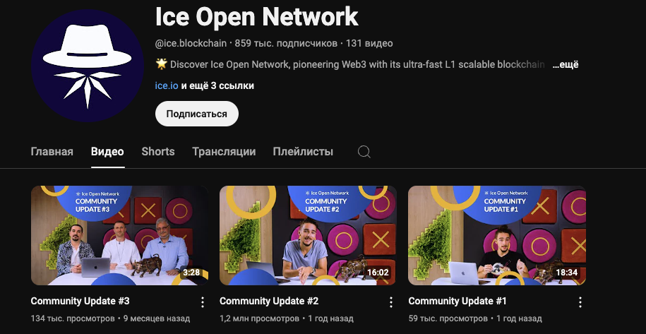 В рамках проекта существует YouTube-канал – ice blockchain. На него подписано 859 тысяч пользователей. На канале всего 3 полноформатных ролика. Они получили от 60 тысяч до 1,2 миллионов просмотров.