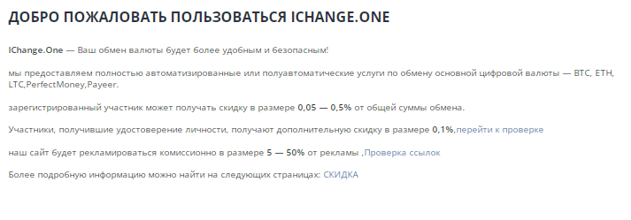 iChange One – это обменник электронных и криптовалют, предлагающий услуги по обмену Bitcoin, Ethereum, USDT и других активов на фиатные деньги.