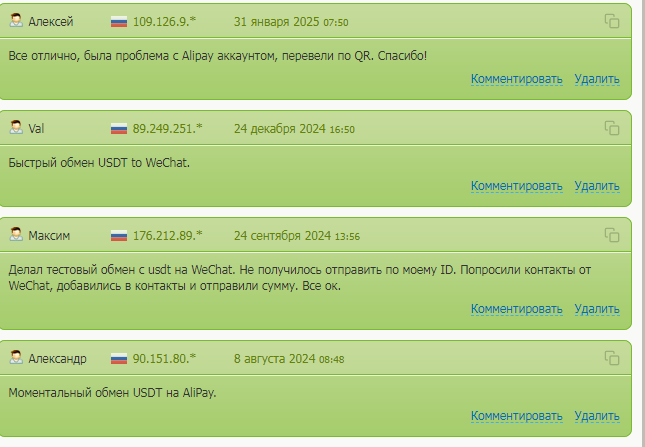 Отзывы клиентов об обменнике противоречивы. Часть пользователей сообщает о быстрых и успешных операциях, особенно при небольших суммах. Алексей в январе 2025 года подтвердил решение проблемы с AllPay, а Валерий отметил моментальный обмен USDT на WeChat.