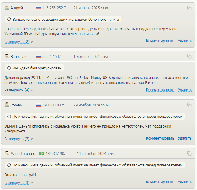 Однако встречаются серьезные жалобы. В ноябре 2024 года Роман столкнулся с непоступлением средств на PerfectMoney после списания с кошелька. Поддержка не реагировала на обращения. Аналогичная ситуация произошла у Андрея в январе 2025 — перевод в WeChat не дошел, а ответы от службы поддержки прекратились.