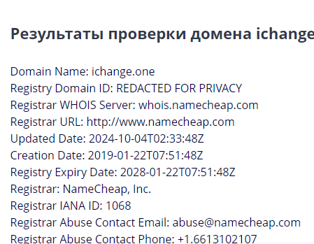 Обменник «Айченч» работает с 2019 года. Домен ichange.one зарегистрирован через NameCheap и продлен до 2028 года. Это говорит о долгосрочных планах проекта. Данные о владельце скрыты. Такая практика встречается у многих обменников, но снижает уровень доверия. Открытость информации о команде могла бы добавить прозрачности.