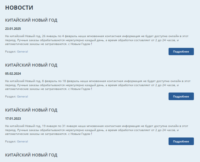 Новостной раздел годами публикует однотипные сообщения о китайском Новом годе. Актуальных обновлений по работе сервиса или изменениям условий нет.