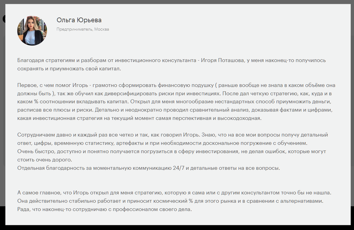 Несмотря на то, что автор позиционирует себя как эксперта с большим опытом, нам не удалось найти комментарии о взаимодействии с ним на сторонних площадках. Как уже говорилось выше, Игорь Поташов размещает весьма подробные и развернутые отзывы на своем сайте, но выглядят они, мягко говоря, настораживающе: