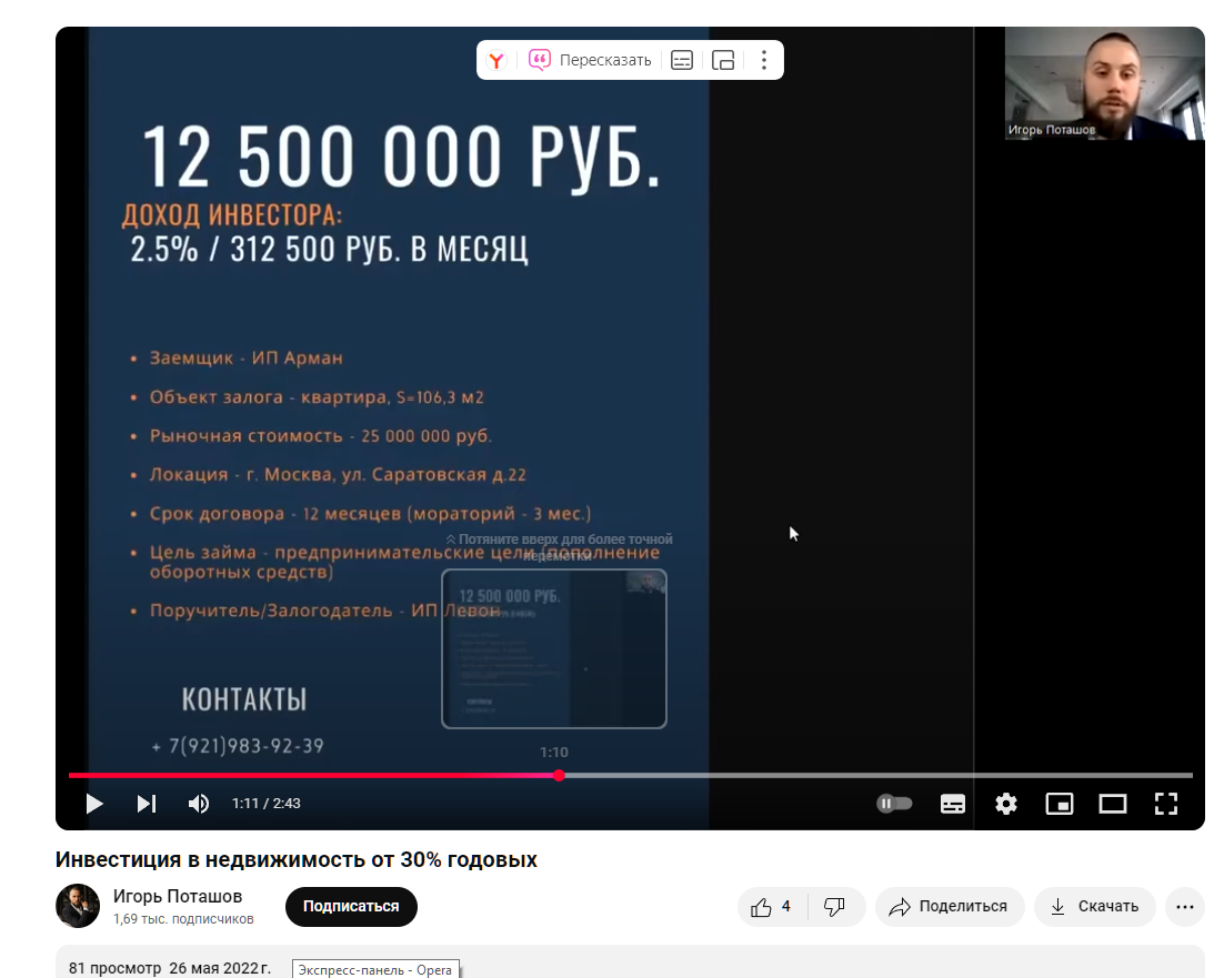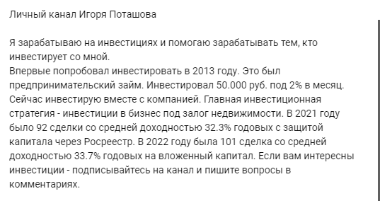 Игорь утверждает, что в 2021 году он участвовал в 92 сделках, которые принесли доход свыше 32% годовых с защитой капитала с помощью Росреестра. Также на Ютуб-канале Игорь Поташов инвестиции уверяет, что годом позже он заключил уже 101 сделку.