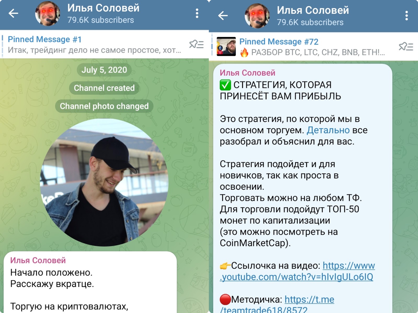Трейдер с Москвы Илья Соловей ведет Тг канал по крипте с 5 июля 2020 года. На него подписано 79.6k человек. Постами интересуются до 20k пользователей, и это хороший показатель активности.
