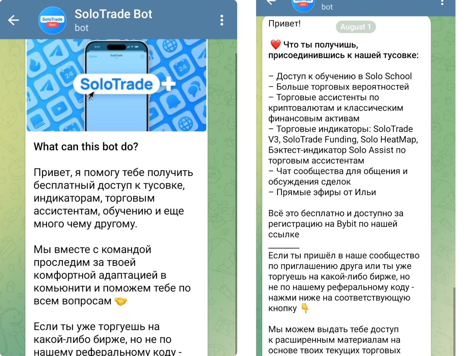 Важно отметить, что Илья предлагает получить и бесплатный доступ к индикаторам, обучению и стратегиям. Участники также получат прямые эфиры от трейдера и чат с другими пользователями. Для начала нужно перейти к боту Solo Trade Bot, который отправит условия сотрудничества.