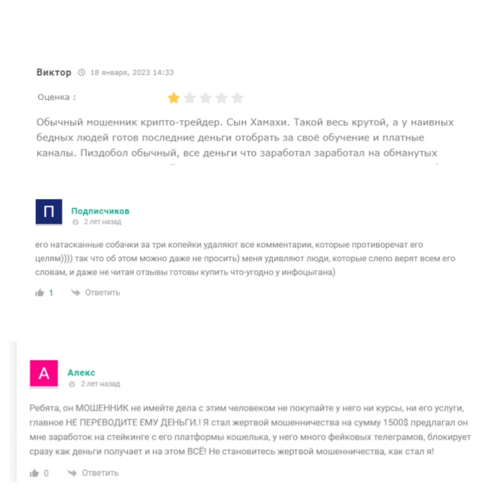 На сторонних ресурсах есть негативные отзывы реальных людей о том, что трейдер Илья Соловей занимается мошенничеством.