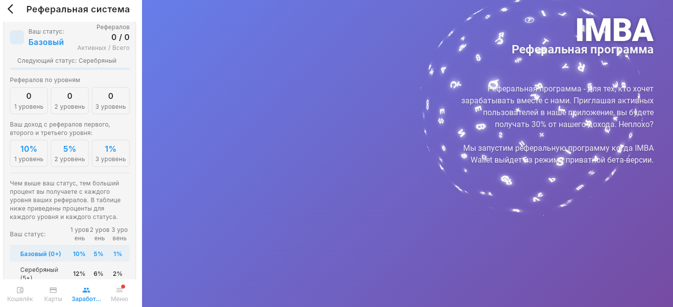 Для дополнительного заработка есть реферальная система «Имба Валлет». У партнерки 3 уровня: 10% за первый уровень, 5% за второй и 1% за третий. В целом пользователь получает до 30% дохода компании в рамках рефералки.