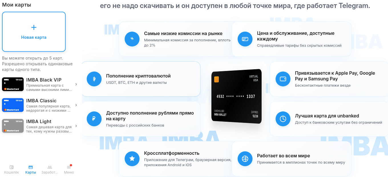 И последний плюс сервиса «Имба Валлет» — ничего не надо устанавливать. Проект можно использовать прямо в браузере. Через личный кабинет надо лишь пополнить счет, а через ApplePay или GooglePay — привязать выпущенную карту к телефону.