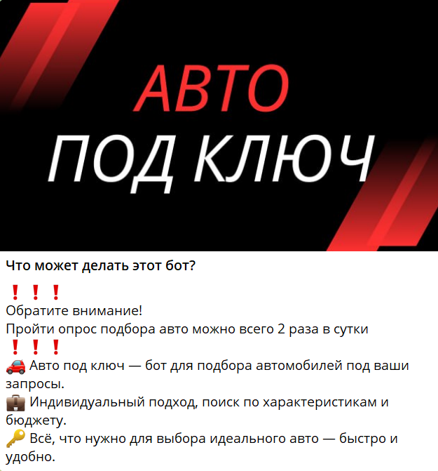 У магазина есть телеграм-бот «Подбор Авто Под Ключ» (FirstCarsBot). Он помогает клиентам найти автомобиль, который подойдет по их индивидуальным запросам и бюджету.